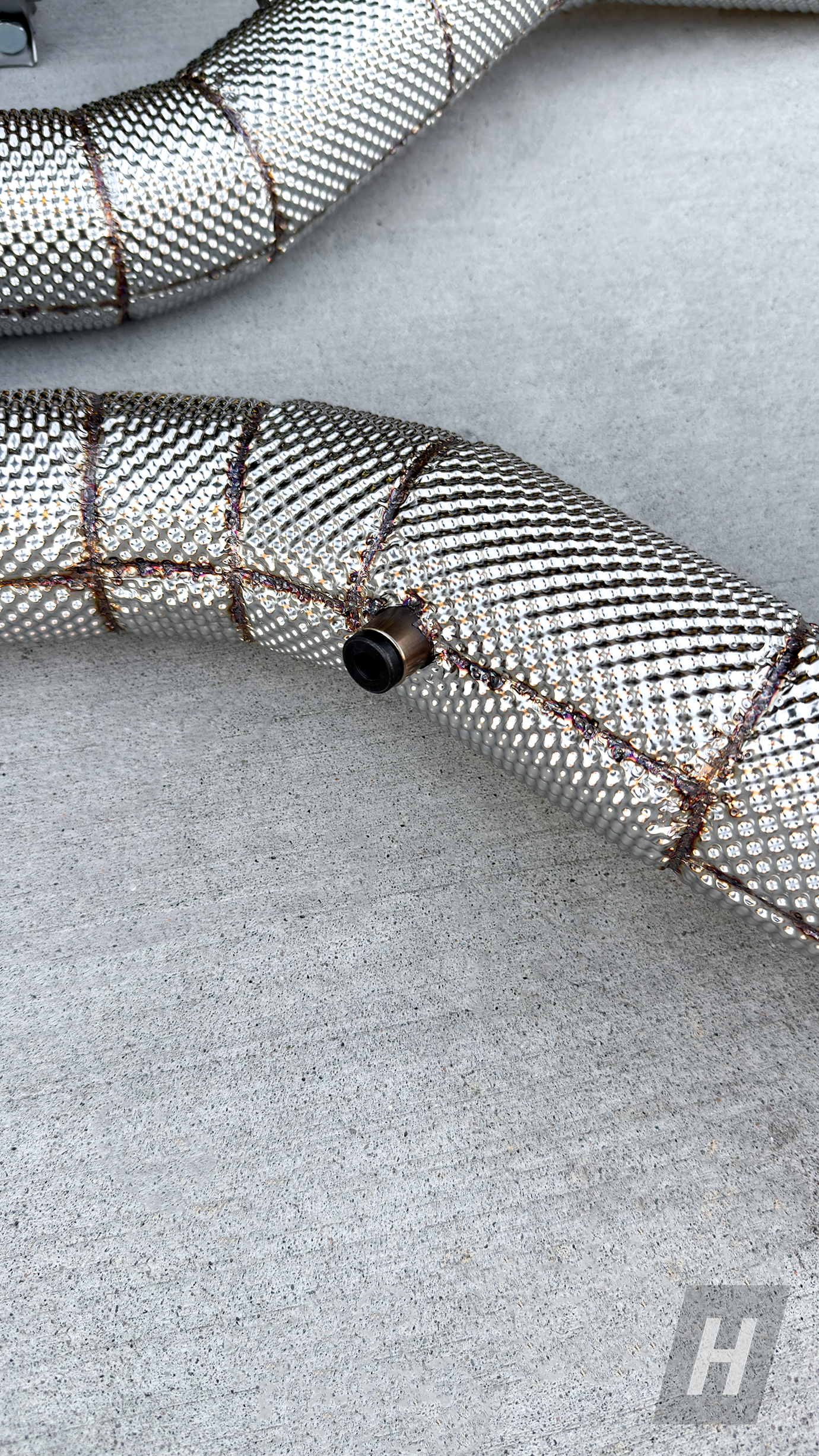 A custom-formed heat shield is integrated around the front section where the midpipe connects to the downpipes. This helps protect nearby components and reduce tunnel temperatures, especially during high-performance driving or extended operation in warmer conditions.