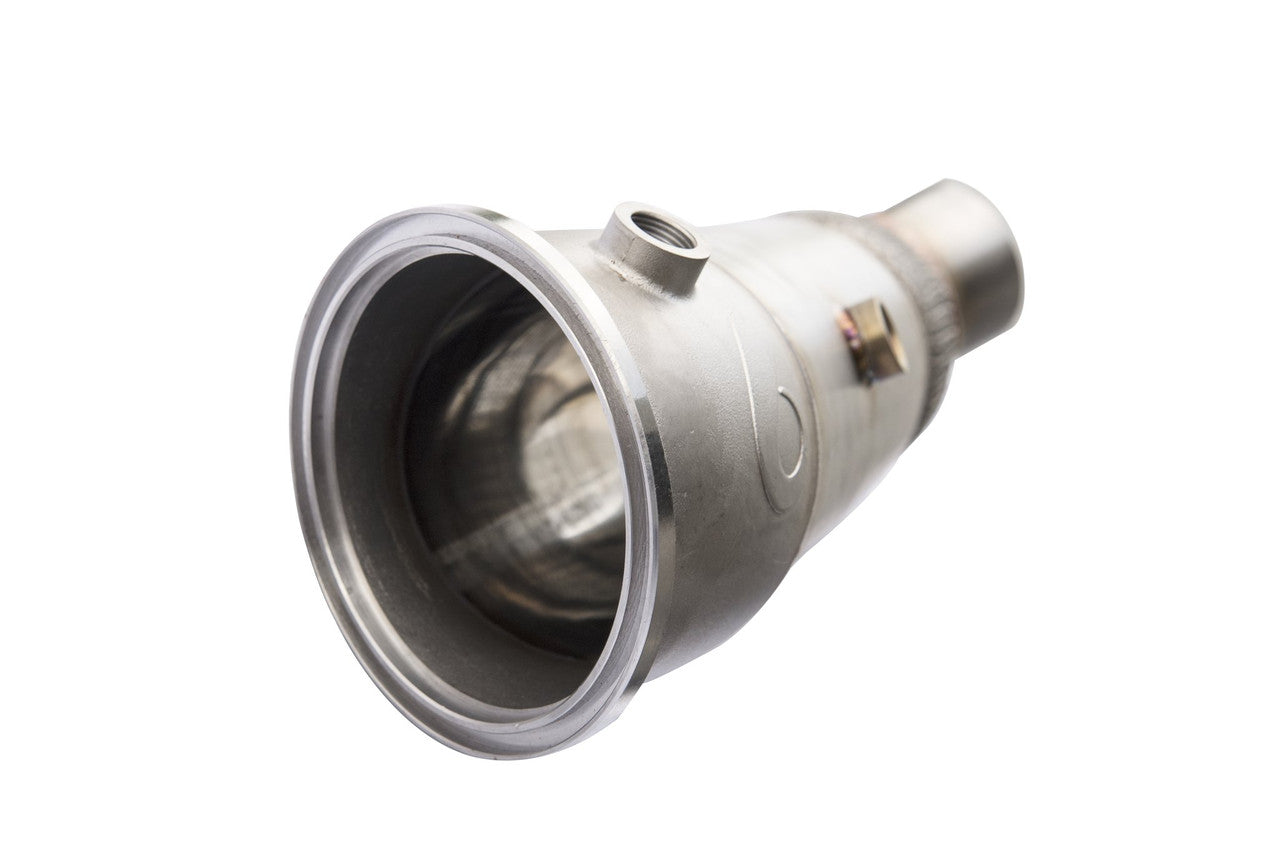 The Active Autowerke Supra MKV Signature down pipe utilizes 4.5” diameter stainless steel piping in order to provide more power, quicker spool, and extreme durability. It then tapers down to 3.5" where we've incorporated a stainless flex joint and then down to 80mm to meet the OEM exhaust system. We never drop the diameter to smaller than the stock diameter of 80mm.