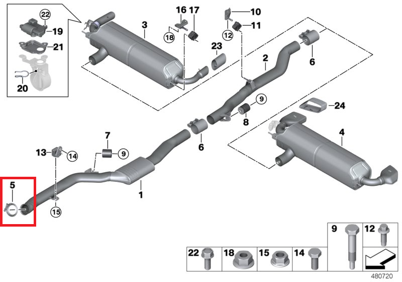 Located between the catalytic converter and the midpipe. This clamp with built in gasket is used to connect the N55 downpipe to the midpipe.