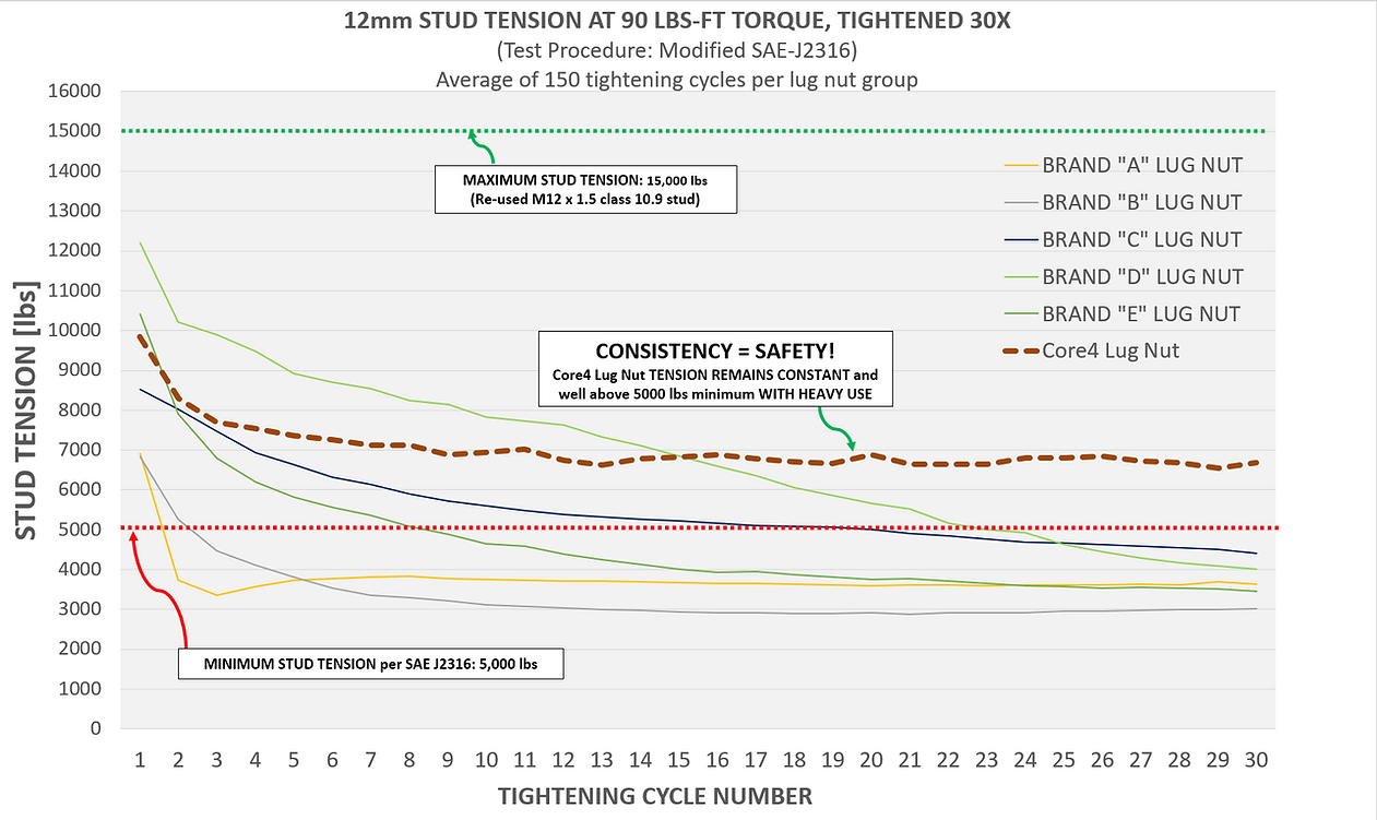 By eliminating the detrimental effect of aluminum galling on stud preload (see chart in pic gallery), the Core4 Flugs can generate optimal stud tension/preload from the 1st time you tighten them when new, to the 30th+ time, without lubrication anywhere on the threads or nut seat. No other lug nut achieves this, regardless of coating type. Long term tension consistency = long term safety and long stud life.