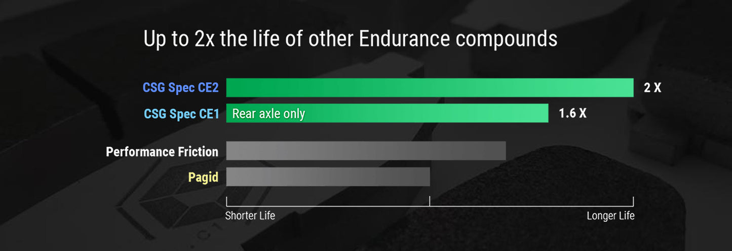 CSG Spec Endurance friction materials are developed to meet the wear resistance needs of customers that participate in longer race distances (10-25 hour races) or would like to get maximum life out of their brake pads.
