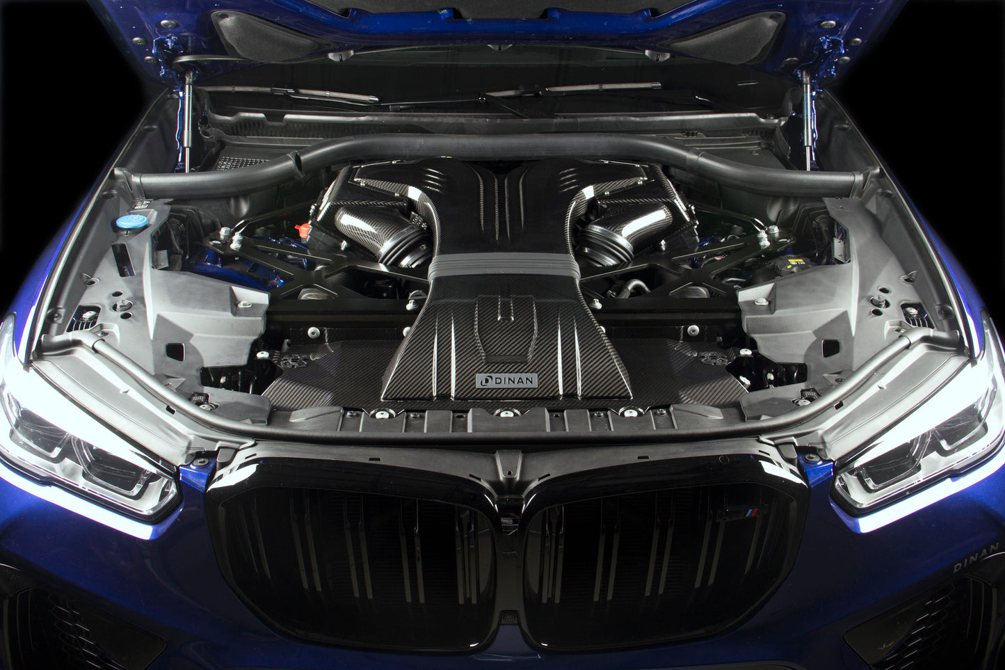 Being the quintessential performance SUV in the marketplace, the X5M is the perfect canvas to showcase a work of art for the entire enthusiast community to see. Creating an indelible mark upon the vehicle, and in particular the engine bay, the Dinan carbon fiber cold air intake is not just a work of art but a piece worthy of bearing the label of "masterpiece." With gloss UV coated carbon fiber stretching from the front of the engine compartment to the rear it's hard not to be impressed by the sheer volume of carbon. The majority of it comprised of a fully functional secondary air inlet which doubles as an ornate engine cover. As such, signature BMW engine cover design elements signifying the cylinder count are integrated into the design for factory like continuity and a nod to a long history. The cosmetic beauty of the system does not solely derive from the presence of carbon however. The immense central passage also purposefully bisects the engine compartment to ensure the factory bracing, which is impressive on its own, is visible. With both OEM and Dinan elements showcased simultaneously the overall engine bay retains symmetrical harmony and commands attention at all corners. Beyond outward appearances and upon closer inspection details emerge which showcase the level of care taken in the intake systems design beyond simply aesthetics. For instance, the secondary air source is deriving its contents from an unobtrusive central hood scoop located behind the front grilles that feeds into the newly formed inlet hump at the front of the engine bay. Through constant CFD analysis, the design of the scoop and secondary inlet continually underwent improvements in order to meet the demand of an even and un-agitated air supply to each air box. In its final form, accents in the carbon both provided a visual embellishment as well as created the outward manifestations of the runners used to direct and smooth the secondary air flow. The additional air flow ultimately supplements the factory inlet locations on both the left and right air boxes with ambient air from outside of the engine compartment. These air boxes have been enlarged and equipped with massive filters to handle this increased volume and together with the rest of the system allow the intake to flow as efficiently as possible. While the stock intake system is adequately suited to support up to stage 1 power levels that does not mean there is no performance benefit when upgrading to the Dinan system. Besides its jaw dropping appearance the biggest advantage of the system, by virtue of additional and optimized flow, is the reduction of the pressure depression in the stock system. This equates to the turbo having to work less in order to achieve targeted power. With the turbo working more efficiently this also means a lower pre-turbine backpressure, lower turbocharger shaft speeds, lower turbocharger compressor discharge temperatures, and for the ability to achieve higher boost pressure levels. Paired with the natural improvement to throttle response, a bump to the acoustics, and an unequalled visual appeal the Dinan F9x X5M/X6M carbon fiber intake system can wear the self-appointed moniker of "masterpiece" without trepidation.