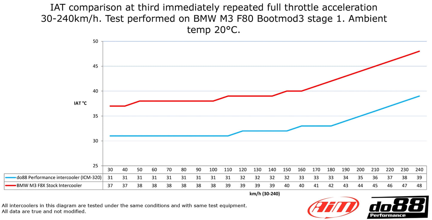 Our mission when starting this development of a new performance intercooler was to eliminate the OE intercoolers weaknesses and of course offer a great performance increase. During all test we have carried out during the development of our entire BMW F8X M2C/M3/M4 product range we see clearly how the peak power is directly equated with the IAT (Intake Air Temperature).