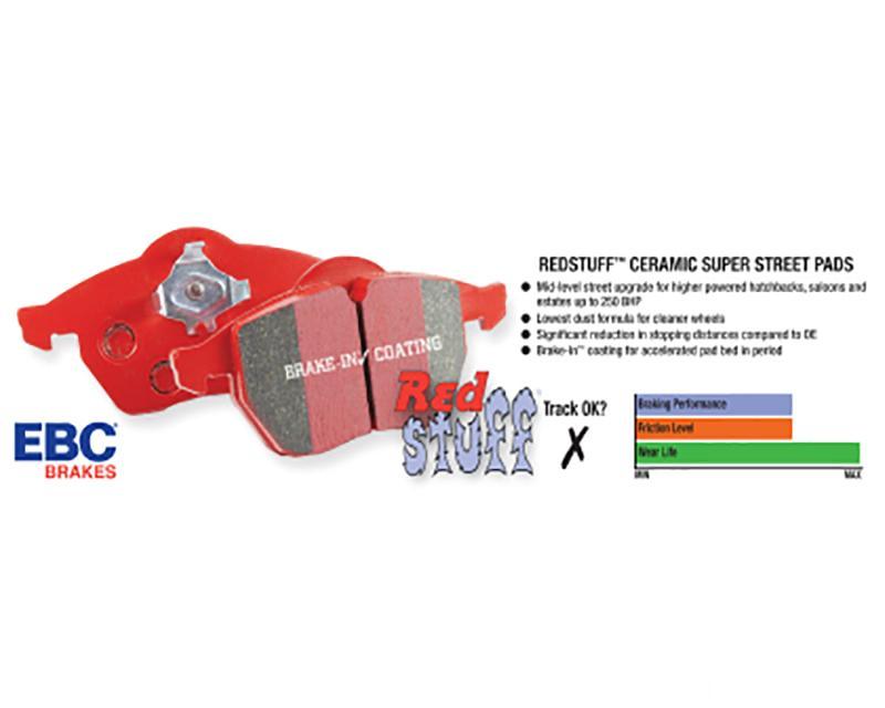 There are TWO reasons our customers love Redstuff, First because they are the lowest dust pad we have encountered by reducing dust by 60-90-percent. Plus the minimal dust you see is very easily removed with a simple sponge wash as it contains no steel fiber particles as in ALL OTHER pads. Second they brake like an alligator right from cold (as good as Original pads or better) and just get better as they heat up. This material is a Synthetic Fiber based brake compound enhanced with ceramic particles. If you have previously tried EBC redstuff (pre-ceramic compound) this material is light years ahead. It lasts longer; it brakes better and is quieter. Being a hard wearing pad, bed-in times can be as long as 1000 miles and drivers must be patient until the pad takes up the shape of their disc (brake rotor). This is a truly impressive fast road pad for repeated heavy braking.It emits far less dust than semi-metallic pads and has been proven to stop a passenger car/sedan/sport compact/hot hatch 13 meters quicker than OEM pads from 100mph/160kph. Features EBC Brake-In surface coating which conditions rotor surface and accelerates pad bed-in. Nominal friction coefficient 0.5 with approx. 50-percent dust reduction. Most EBC Red Ceramic pads are approved to ECE R90 brake safety regulation.