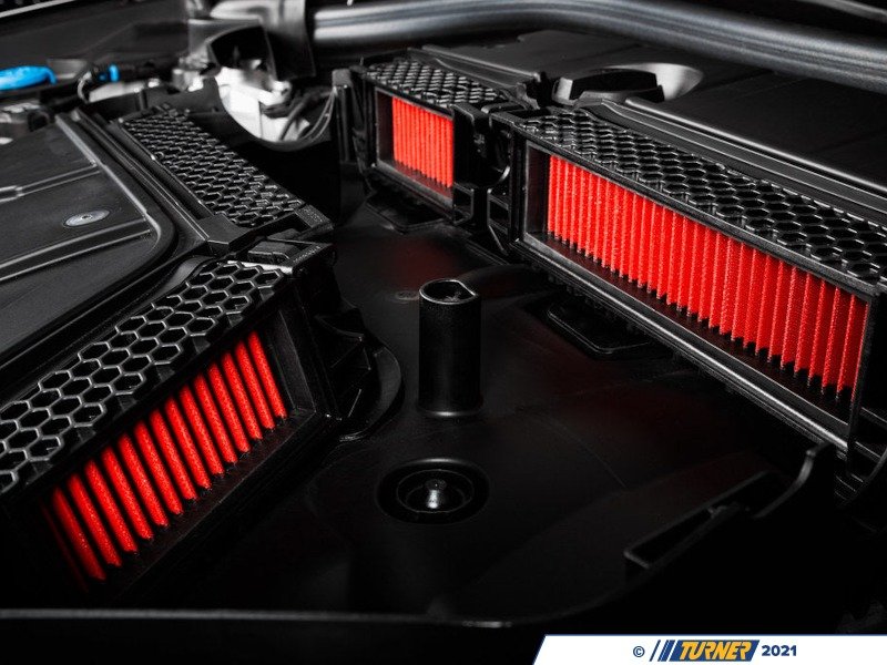 The X3M/X4M intake setup from BMW although awkard at first sight, is a very well designed system in the given space available. The flow path from the filters to the turbo inlets is very direct and does not change direction as abruptly as the usual OEM airbox designs. So instead of a complete redesign we focused on improving the OEM airbox with less restrictive flow and improved temperature efficiency. We have developed replacement drop in filters made from non-woven mesh which have a much higher flow rate as compared to the stock paper filters. To help reduce inlet air temperatures and force air into the airbox, we designed large front scoops which sit behind the grills. The carbon scoops channel air into the ducts and effectively effectively de-restrict the inlet side of the airbox. The final piece is the carbon airbox lid which although doesn't add to the performance, it does allow for a more audible induction sound and gives the engine bay a much needed aesthetic improvement.