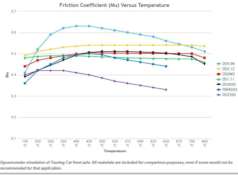 Feel, Feedback, Stability, and Torque Curve (Not Ranked in Any Order):DS2500 has a considerably lower mu than the DS3.12 and DS1.11 at all temperatures. They are a better match to street tires than they are with racing tires. While their performance is stable, their torque curve declines more with temperature than the other compounds. Despite the lower torque curve, they are going to feel far better than a pure street pad at any temperature experienced on a racetrack.