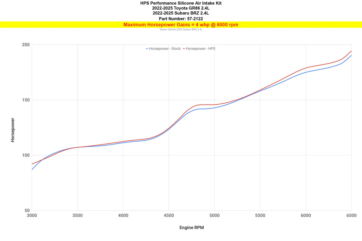 HPS Performance high temperature 4-ply reinforced silicone air intake hose kit (part number 57-2122) is the ideal replacement upgrade from the restrictive stock OEM rubber air intake hose. Engineered with high-heat resistant material, the intake hose can easily withstand temperatures of up to 350 degrees Fahrenheit. Without requiring any retuning, this HPS silicone air intake kit improves Toyota GR86 throttle response by delivering smoother, unrestricted air flow to the engine while preventing heat soak that raises intake air temperatures and reduces overall power output. This kit delivers an additional 4 horsepower and 3.5 lb-ft. of torque. It retains use of the stock air filter housing which minimizes the number of parts to change, keeping the installation simple. This replacement upgrade includes HPS 100% stainless steel embossed hose clamps that are fit for even the harshest road conditions. No additional modifications or tuning are required to install this kit.