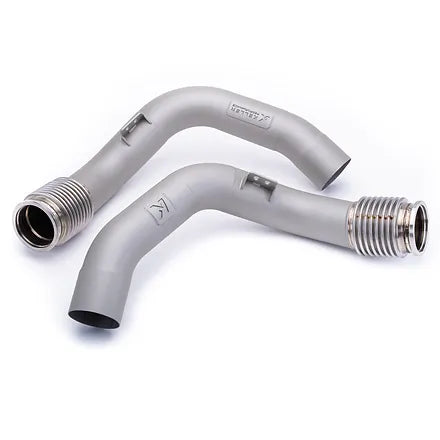 BMW F90 M5 Titanium Cerakote coated race downpipes and mid-pipes are made to eliminate exhaust flow restriction for maximum Horsepower and Torque gains.
