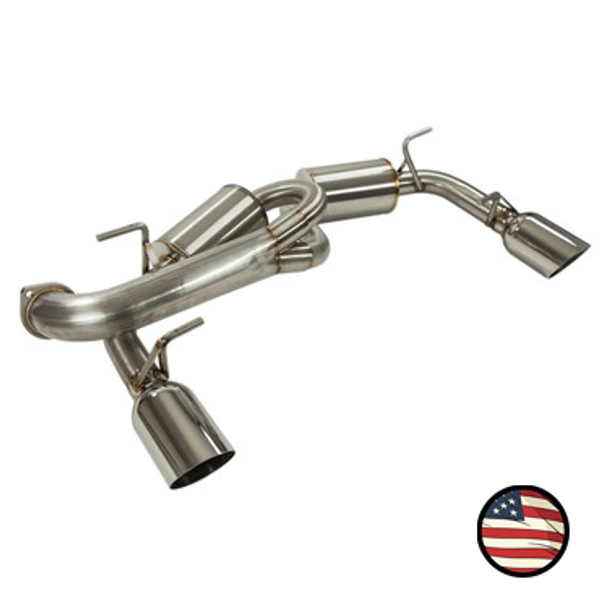 Our axleback has a 2.5" or 3.0" inlet which is larger than stock but not too large. Both split the main circuit to two 2" pipes. Both 2" circuits terminate in 4" diameter tips that sit flush with the bumper. This makes the car look like it should have from the factory.