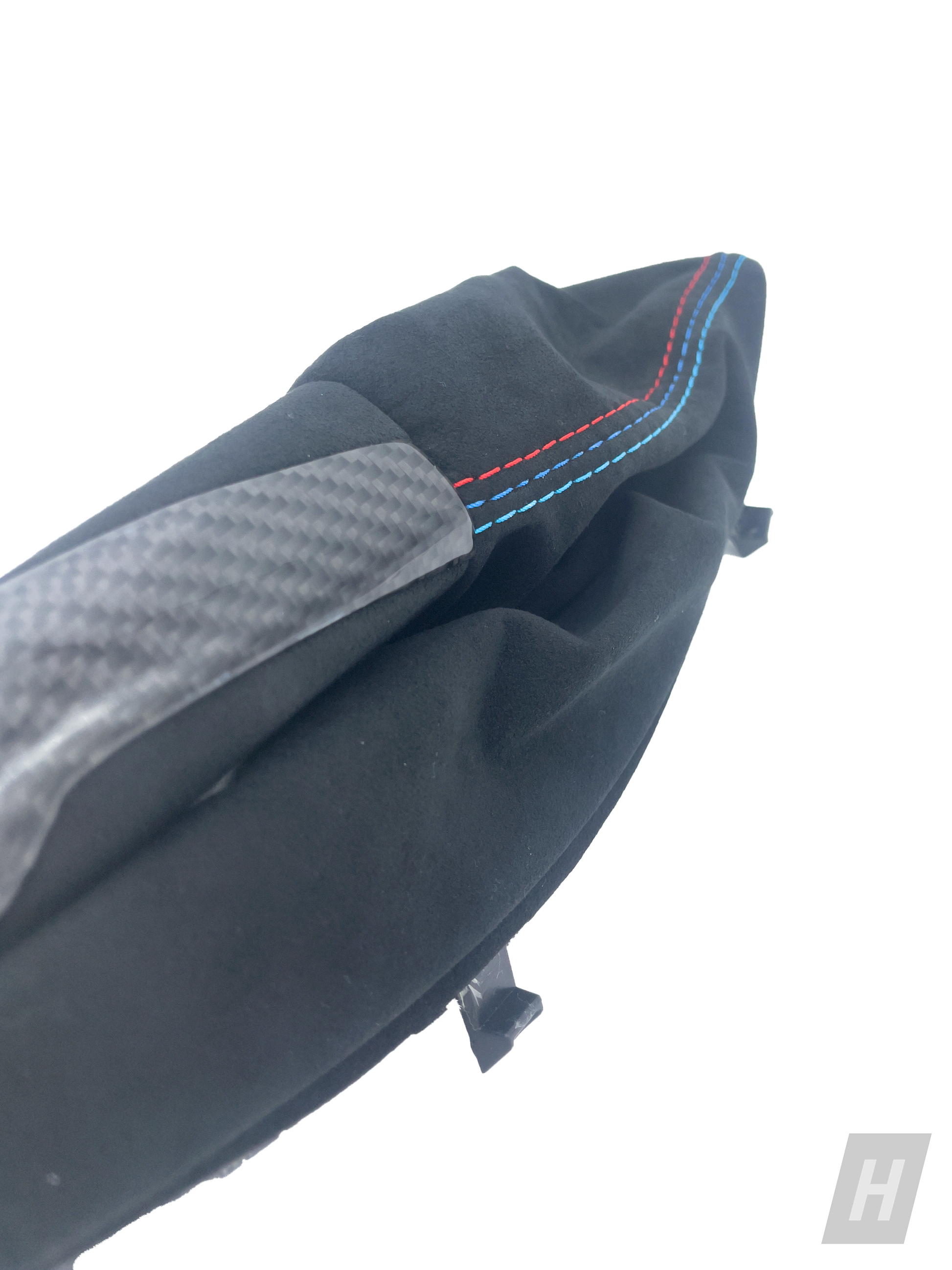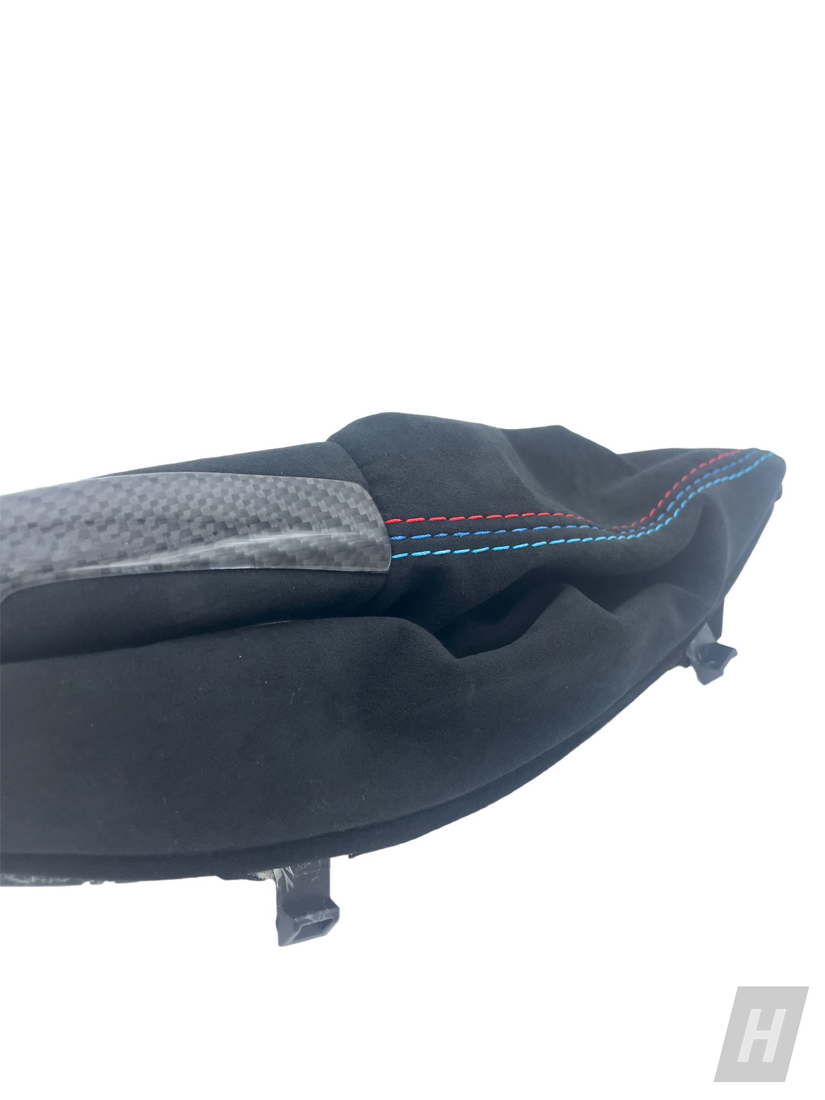 The handbrake is something that is something that is used frequently; however, it is often overlooked. The material combination of carbon / alcantara and the tri-color M seam in the boot compliments the interior of any F8X M and has a more luxurious overall feel than the stock, leather handbrake. It also matches well with the OEM BMW M Performance Armrest, which you can also find on our website.
