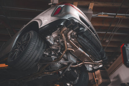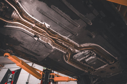 Welcome to the full exhaust suite for the BMW F95/F96 platform. Connecting to stock or aftermarket free flow downpipes, the valved exhaust measures 2.75 inches from inlet to outlet. This system runs unrestricted all the way back to the tips. In our testing and development of this platform, we found that running the setup unresonated provided a more raw sound experience and insane snaps when you change gears. Utilizing a centrally mounted X pipe combines the exhaust tones together to give a very enjoyable sound experience as the revs build. This system reuses the OEM factory electronic valves. Inside the car the experience remains refined and enjoyable at all speeds. There is no drone in the cabin with the valves closed, and when you're enjoying the vehicle in the M2 mode with the valves open, the pops and cracks are more pronounced than stock and the vehicle has a much more motorsport sound to it The S63 sounds decent from the factory but at Valvetronic Designs, decent doesn't cut it.