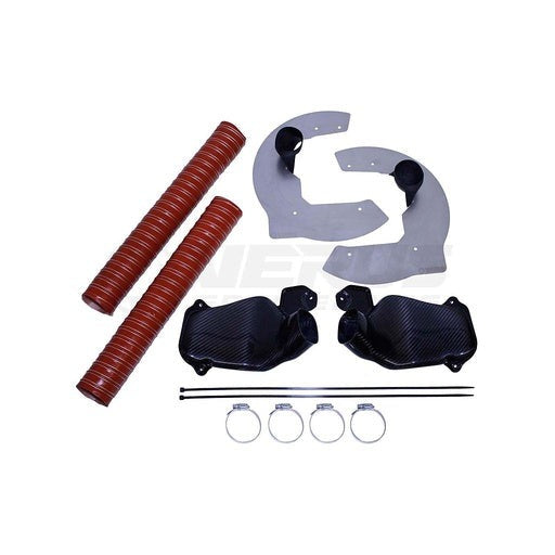 The Verus Engineering Brake Cooling Kit is configured in an OEM style format, with emphasis on the shortest route possible. Using an OEM inlet, carbon fender transition duct, and a well-formed duct on the backing plate, this kit directs airflow into the center of the rotor. The inlet of the kit is a beautiful carbon duct that features a constant cross-sectional area that promotes and improves flow through the brake cooling kit. The kit comes with everything necessary for an install, including pre-cut hose.