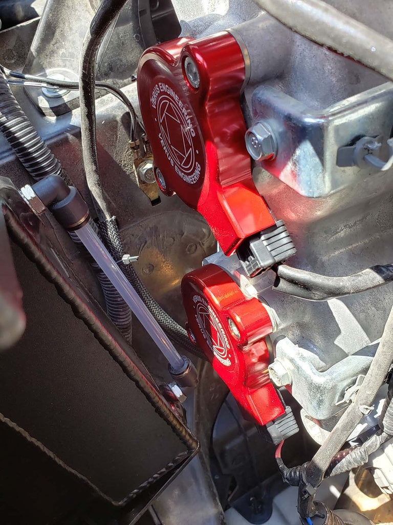 Shield your plastic cam actuator connectors from damage and improve the look of your engine bay with our Front Cam Sensor Cover Kit. These units are crafted out of billet aluminum in the USA, bright dip anodized one of three popular colors, and then laser engraved. The units install painlessly in minutes with simple hand tools. Price is for a set of (4) units.