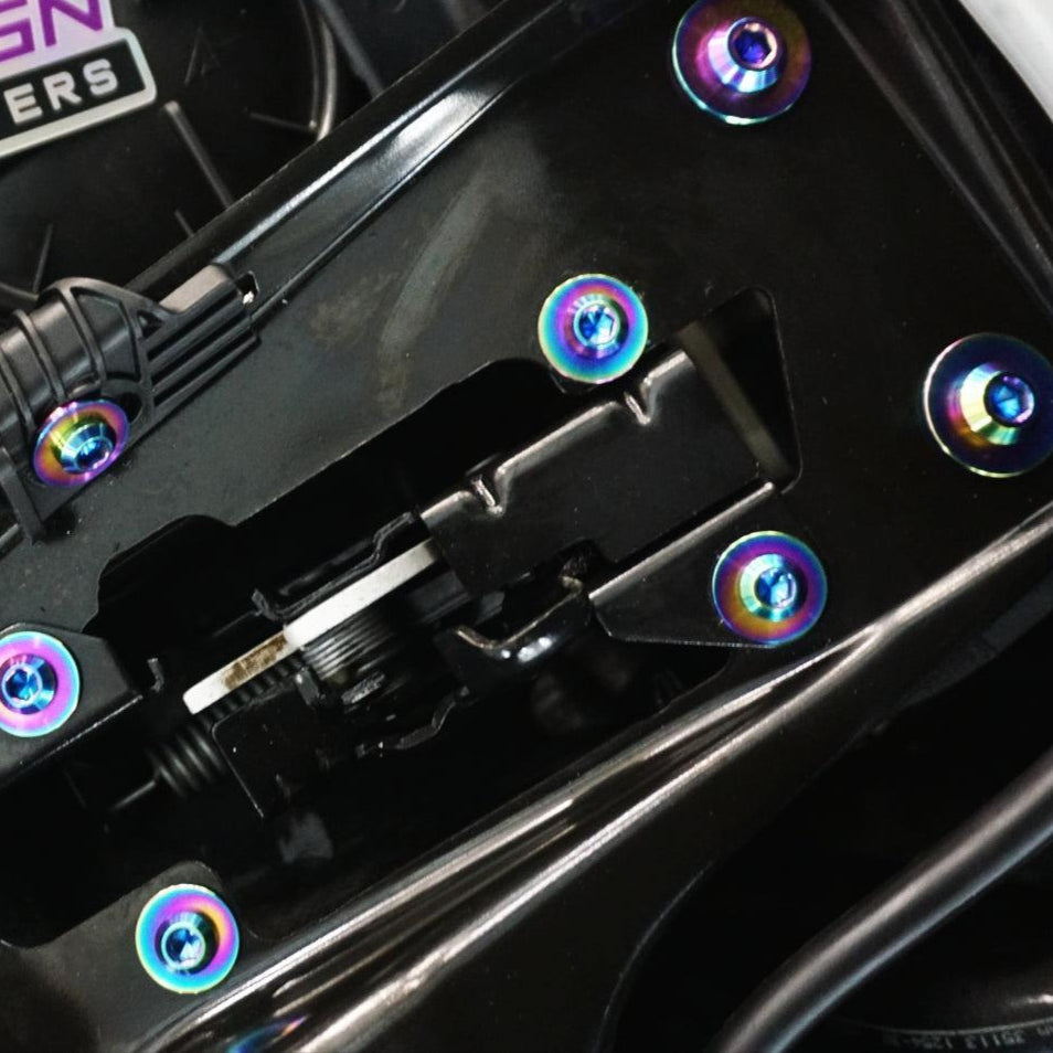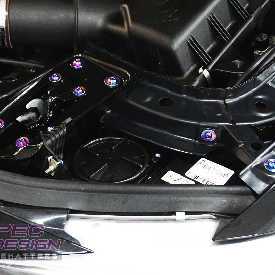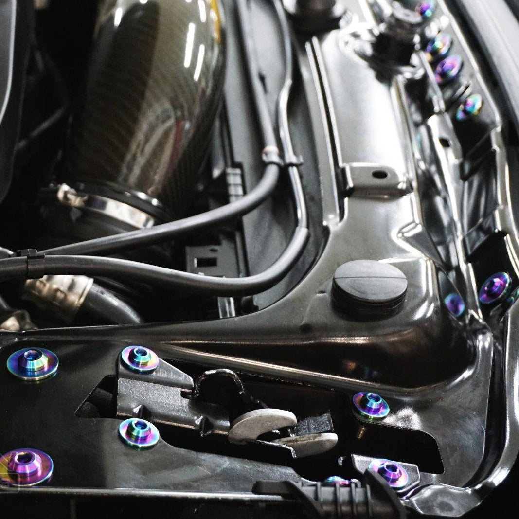 The kit's fasteners are Grade-5 (GR5) Titanium, known for it's lightweight and anti-corrosion properties. Titanium weighs in at ~40-45% of the OE fastener weight while providing an incredible appearance.