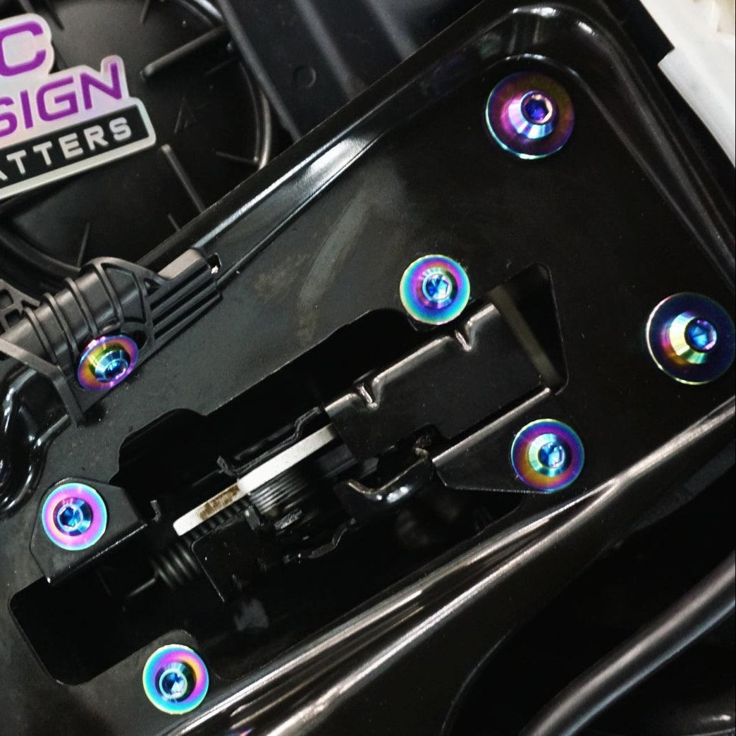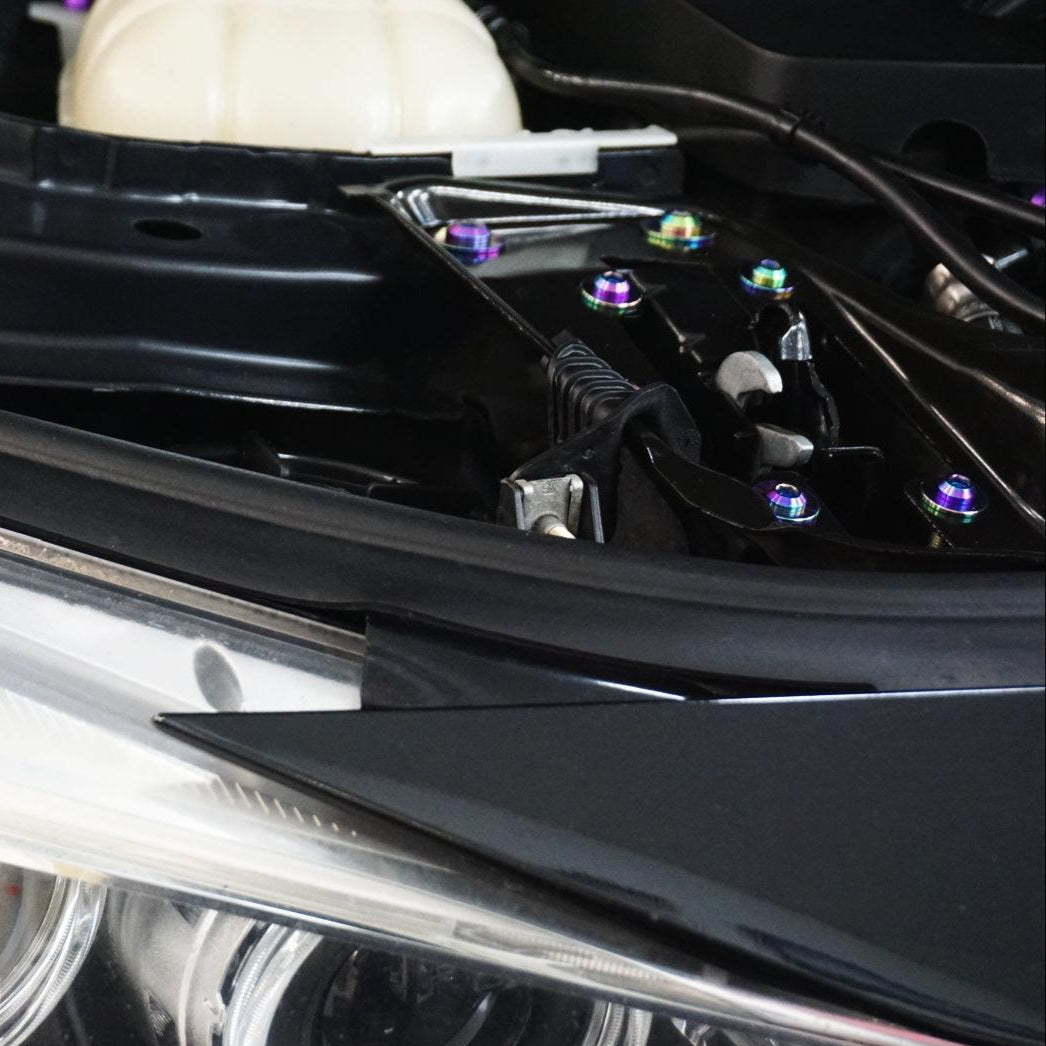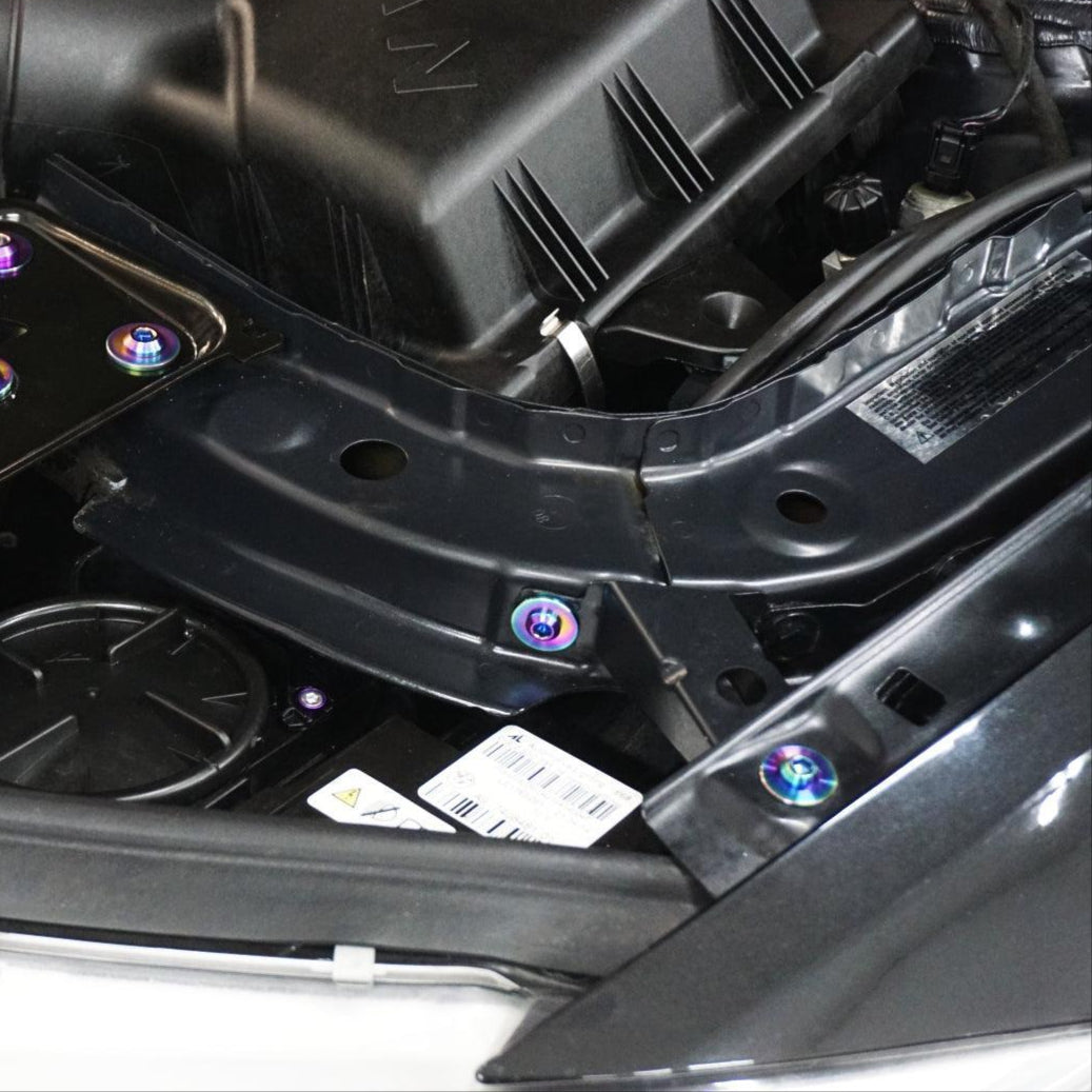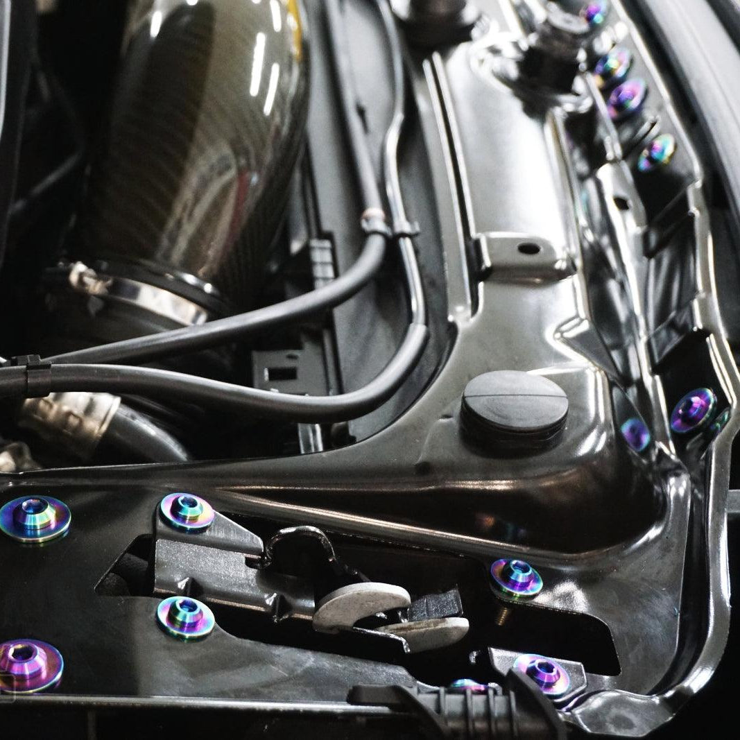 The kit's fasteners are Grade-5 (GR5) Titanium, known for it's lightweight and anti-corrosion properties. Titanium weighs in at ~40-45% of the OE fastener weight while providing an incredible appearance.