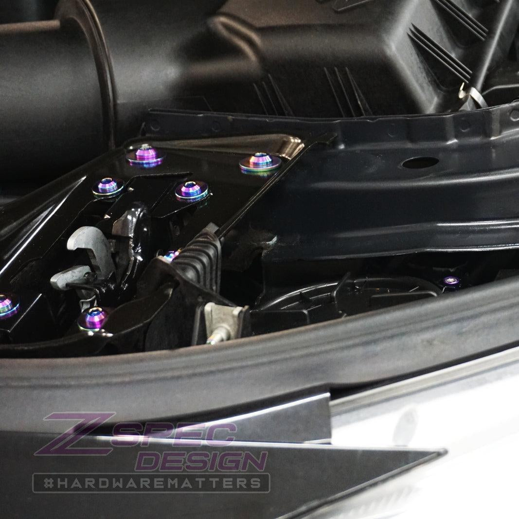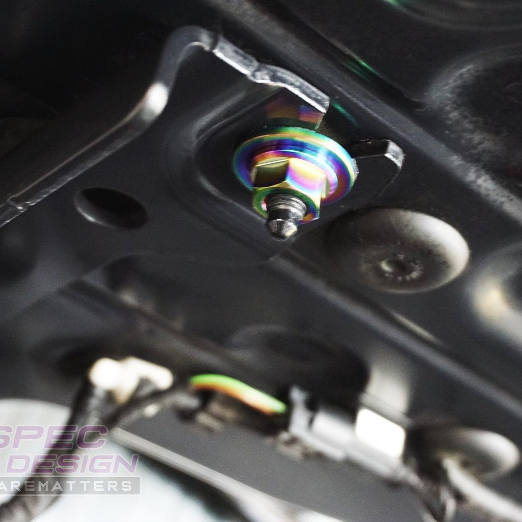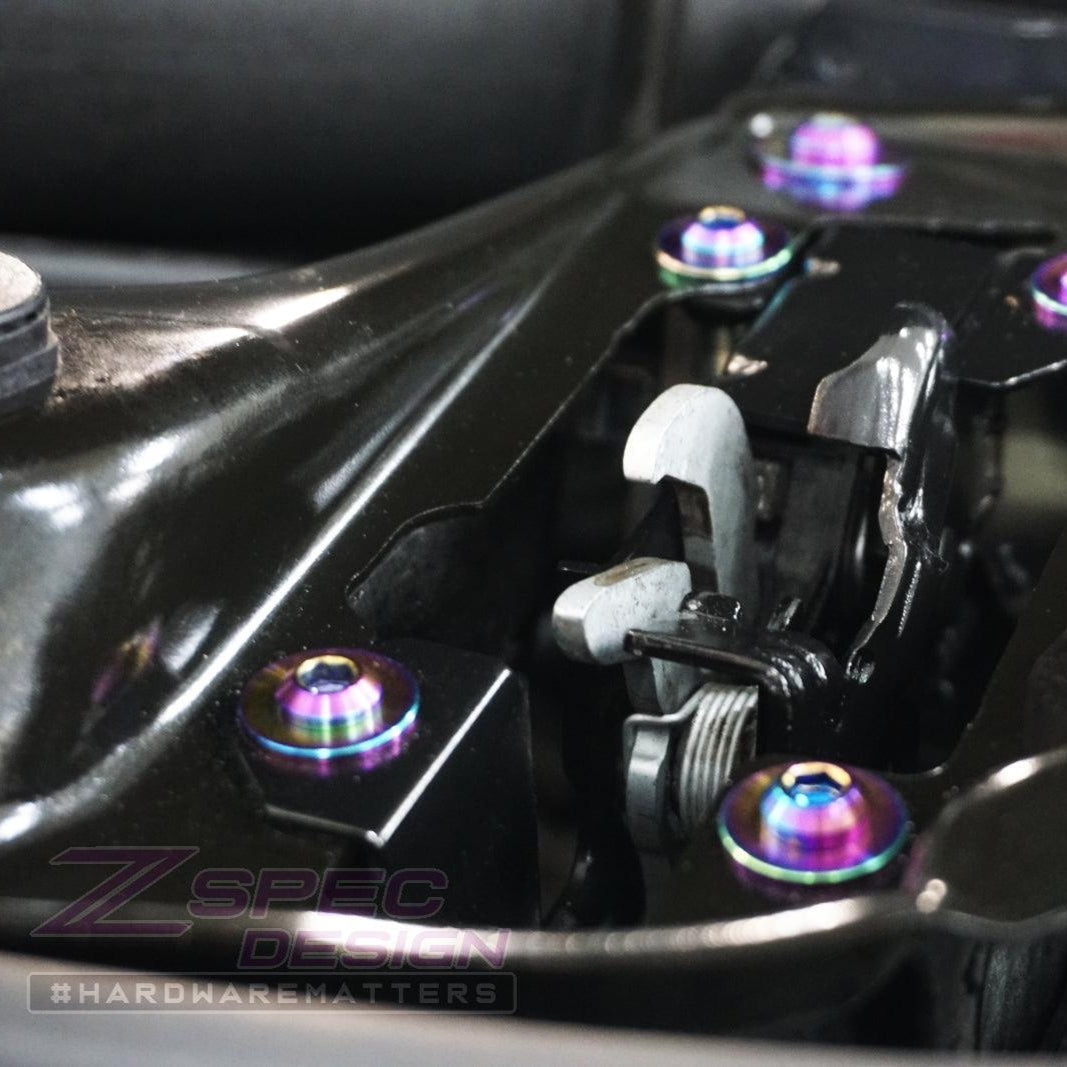 The kit's fasteners are Grade-5 (GR5) Titanium, known for it's lightweight and anti-corrosion properties. Titanium weighs in at ~40-45% of the OE fastener weight while providing an incredible appearance.